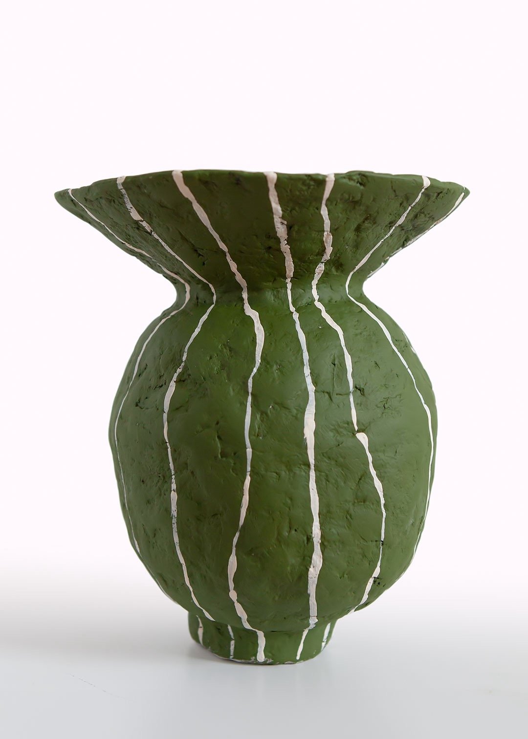 The PINA VASE MOSS GREEN STRIPE is a unique handmade decorative vessel sustainably made from paper-mâché using paper and card waste. A contemporary take on a classic vase, this piece was inspired by the leafy tropics from de la Fuente's roots of the Philippines. The fine broken lines mimic foliage to enhance its organic surface.